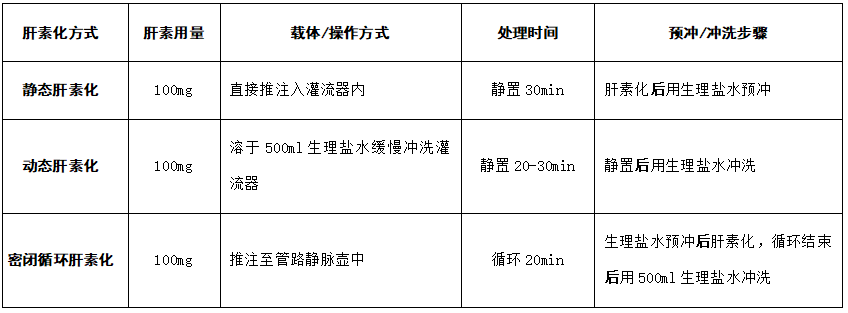 動(dòng)態(tài)肝素化相對(duì)復(fù)雜。根據(jù)SOP的要求,采用動(dòng)態(tài)肝素化時(shí),需要用100mg/500ml生理鹽水緩慢沖洗灌流器,靜置20-30min后,再用生理鹽水進(jìn)行沖洗。