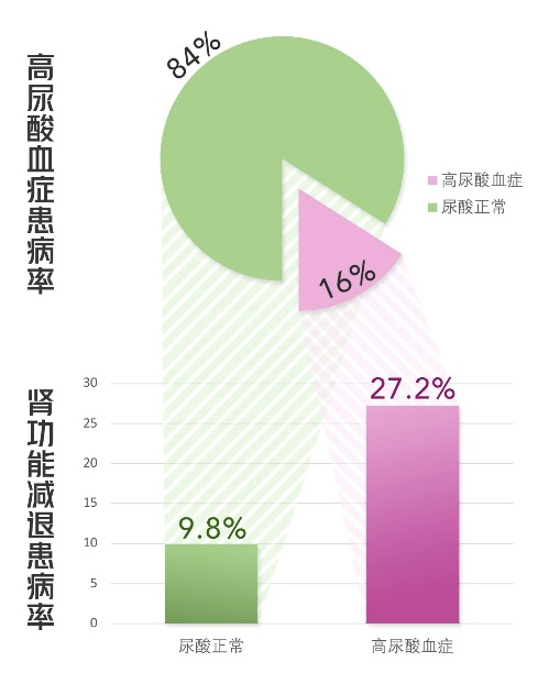 高尿酸血癥與腎功能息息相關。上海某醫(yī)院曾對我國8243名成年人進行了調查,其中1321例受訪者符合高尿酸血癥的診斷標準,其中有359名出現(xiàn)了腎功能減退,發(fā)病率高達27.2%;而其余6922例血尿酸正常的受訪者中僅有680例存在腎功能減退,發(fā)病率僅為9.8%。同時我們發(fā)現(xiàn)出現(xiàn)高尿酸血癥時越年輕,越有可能出現(xiàn)腎功能減退。